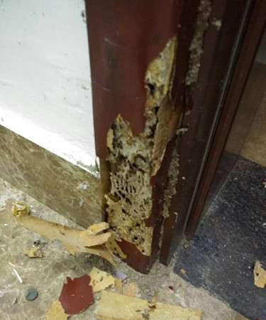 當(dāng)日,李師傅在張女士家中發(fā)現(xiàn),她家里的木質(zhì)家具較多。據(jù)介紹,她入住該房屋才兩年時間,前幾日中午回到家時,不經(jīng)意間用手觸摸到自家房門套表皮,感覺有點(diǎn)異樣,用手指使勁一摁,居然癟了下去。接著撕開門套表皮發(fā)現(xiàn),一大堆白蟻正在啃噬著門框,嚇了張女士一大跳。